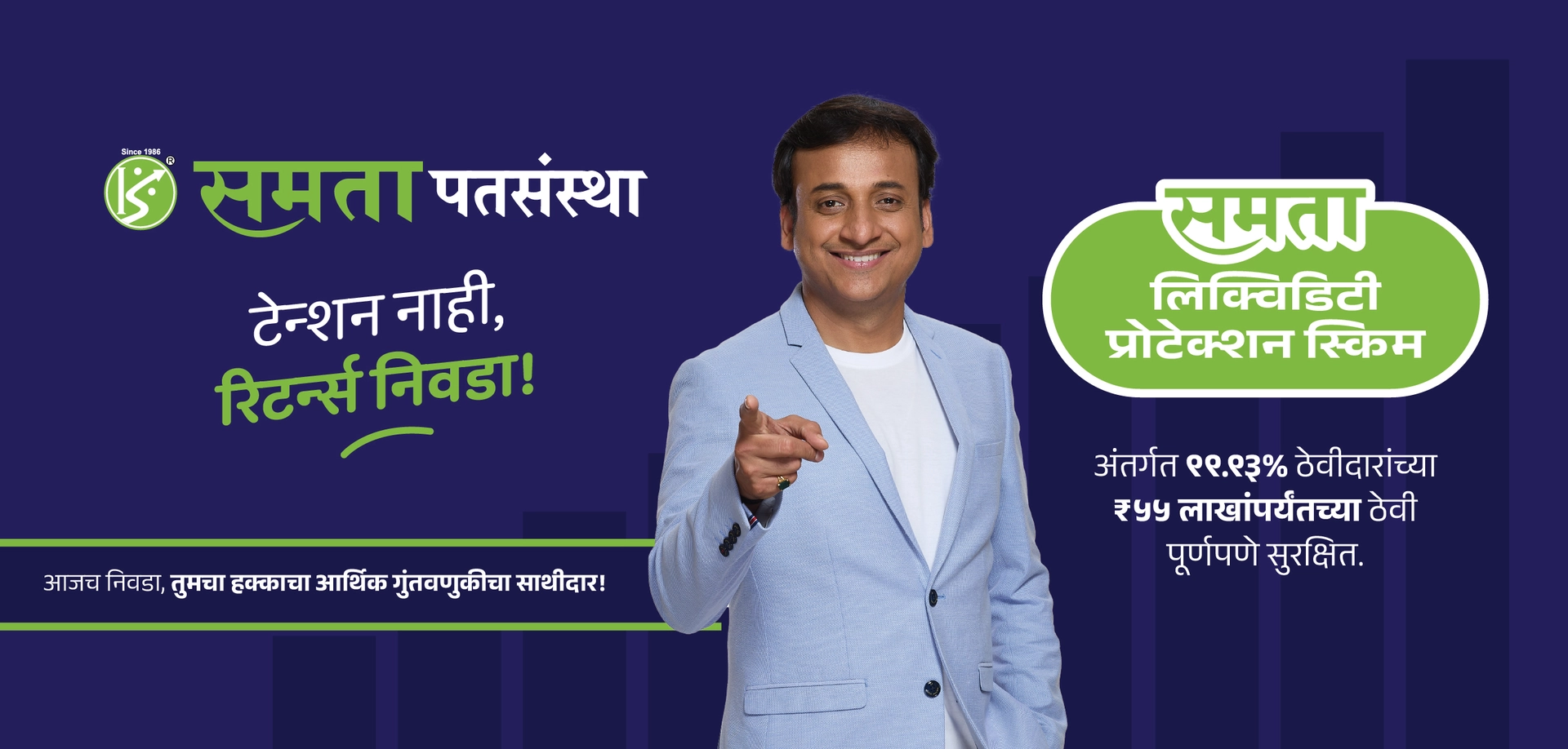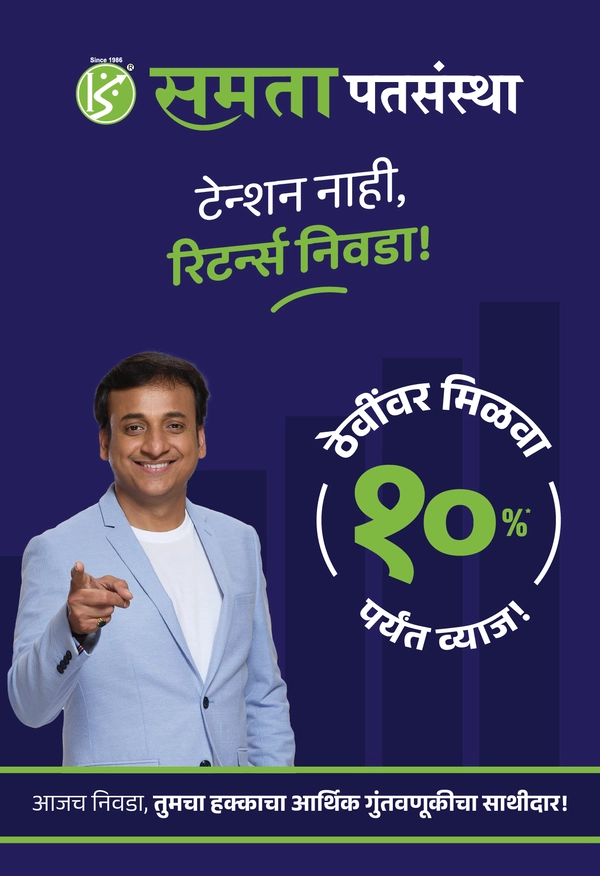 महाराष्ट्र हे सहकार चळवळीचे केंद्र आहे आणि गेली ३९ वर्ष, समता नागरी सहकारी पतसंस्था या चळवळीची मशाल घेऊन उभी आहे. कोपरगाव येथे मुख्यालय आणि २० पेक्षा अधिक शाखांच्या माध्यमातून, समता लोकांच्या मेहनतीच्या पैशावर मोठे आणि सातत्यपूर्ण परतावे देऊन त्यांचा विश्वास जपण्याचे काम करत आहे. या प्रवासात, आम्ही लोकांना योग्य आर्थिक सल्ला आणि सेवा देण्यासोबतच, बदलत्या बँकिंग क्षेत्राशी सुसंगत आधुनिक सेवा देणारी संस्था म्हणूनही ओळख निर्माण केली आहे. समतामध्ये, आम्ही दररोज आणि नेहमीच लोकांचा आमच्यावरील विश्वास दृढ करण्यासाठी कटिबद्ध आहोत.