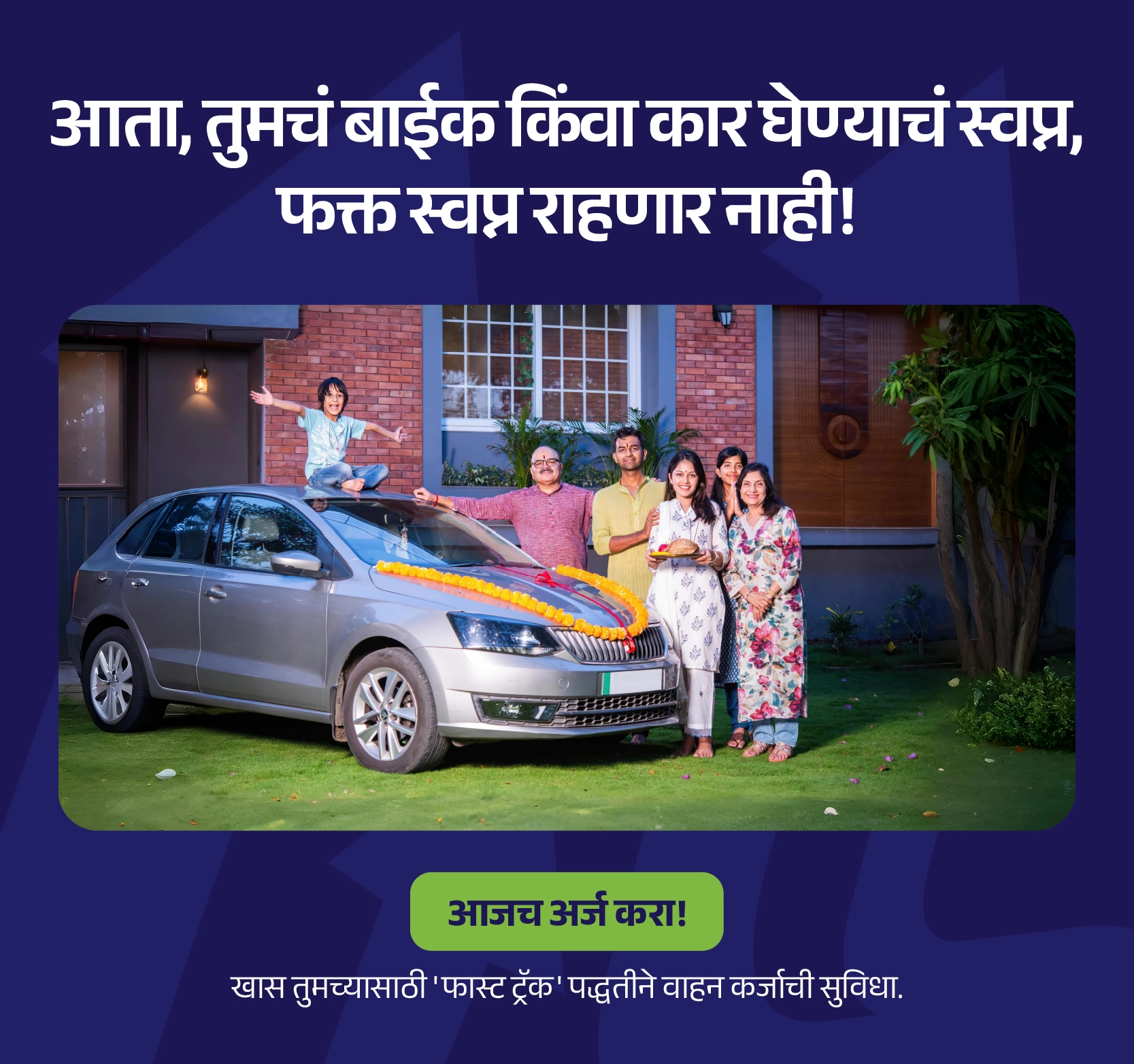 आपली गाडी घेणं हे आपल्यासाठी एक खास स्वप्न असतं. मग तुमची दुचाकी असो किंवा तुम्हाला नेहमी हवी असलेली एसयूव्ही आणि सेदान, वाहन खरेदी करण्याचे स्वप्न आता सहज पूर्ण होऊ शकते. समताच्या वाहन कर्जासह, तुम्हाला वाहनाच्या किमतीच्या ९०% पर्यंत कर्ज मिळते, ज्याची परतफेडीची अट तुम्हाला तणाव देणार नाही. चला, आजच तुमच्या स्वप्नातील गाडी घरी आणण्यासाठी तयार व्हा!