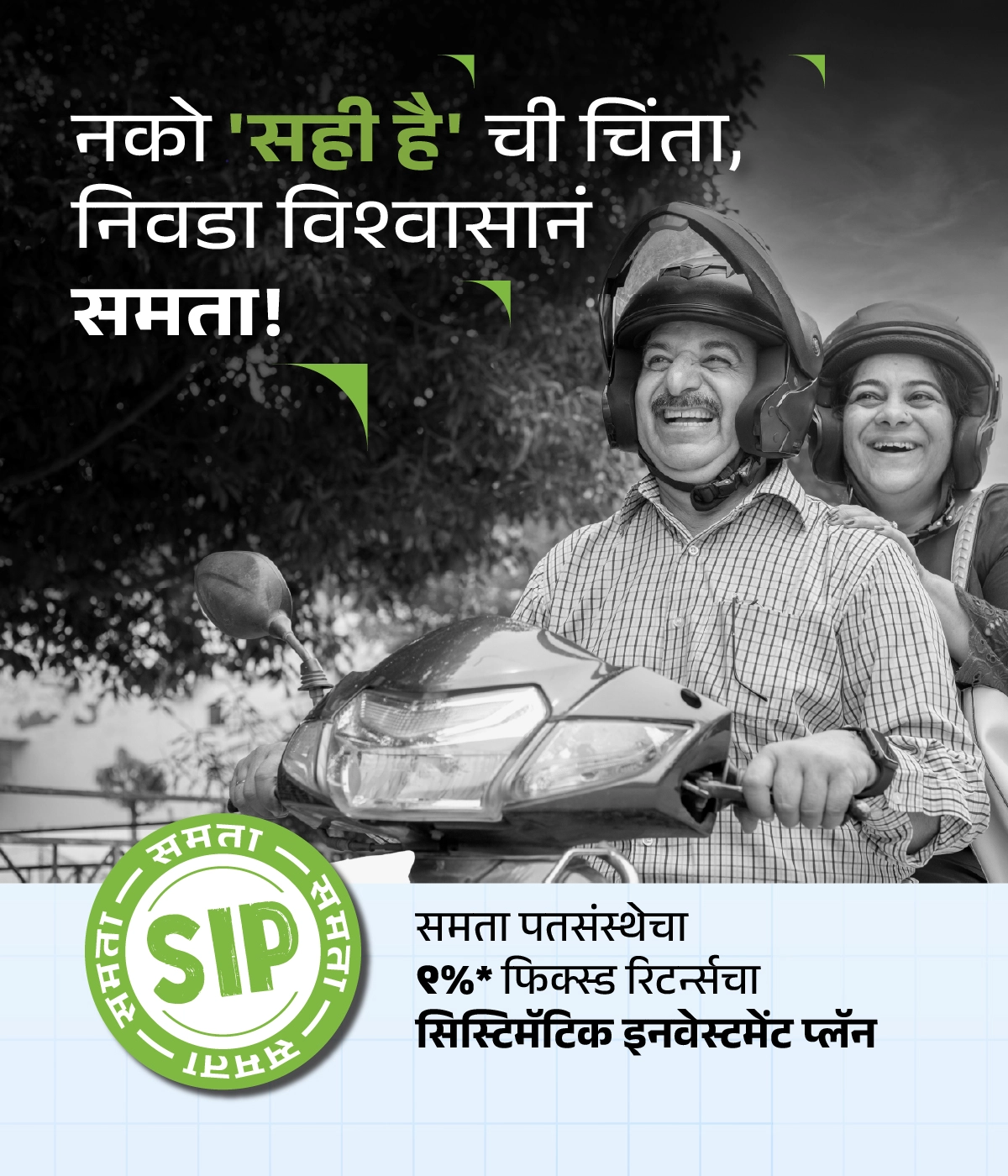 ३९ वर्षांपेक्षा जास्त यशस्वी परंपरेसह, समता ही खात्रीशीर आणि निश्चित परतावा देणारी एसआयपी सुरू करणारी पहिली क्रेडिट सोसायटी आहे. यात सहकार्याचा विश्वास आणि शिस्तबद्ध गुंतवणुकीचा उत्तम मेळ साधला आहे. तुमच्या गुंतवणुकीची पूर्ण सुरक्षा राखण्याची आणि सातत्यपूर्ण परतावा देण्याची आमची बांधिलकी आहे. आजच्या अस्थिर बाजारात तुम्ही ज्या प्रकारची गुंतवणूक शोधत आहात, ती समता एसआयपीमध्ये आहे.
